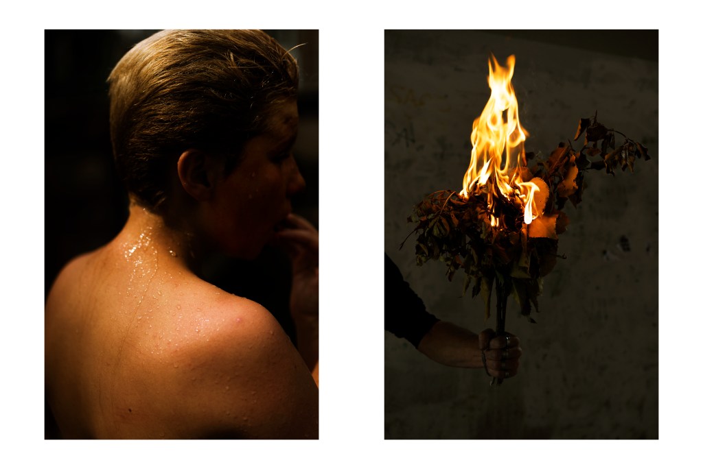 L’eau coule sur le dos nu d’une femme, un bouquet d’herbes sèches a pris feu, nous sommes dans un territoire d’initiation, dans le frottement des antagonismes produisant des étincelles d’éveil.