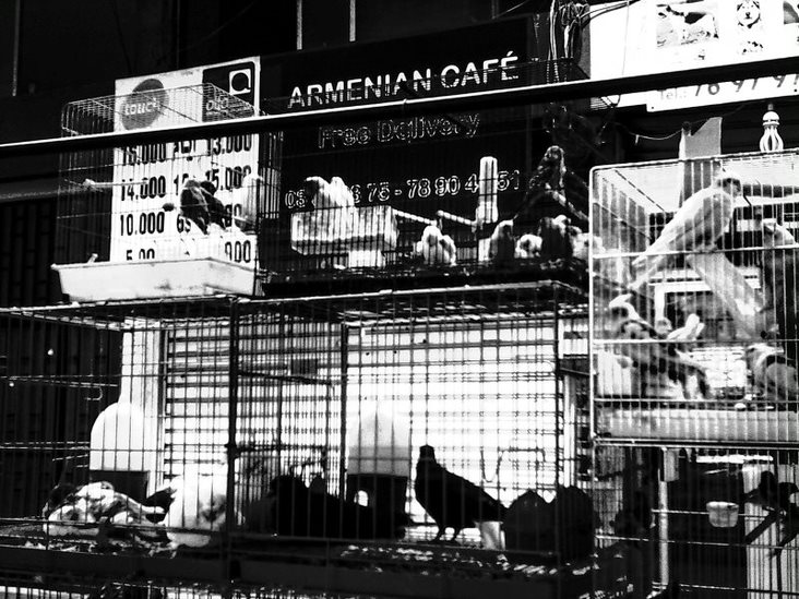 Des bâtiments faisant du funambulisme, un ciel strié de câbles divers, des tentures, des barbelés, du linge suspendu, des inscriptions (Turkey, guilty of genocide / 24 avril 1915) et partout des marques de religiosité, posters de saints, statuettes votives, croix, chapelet.