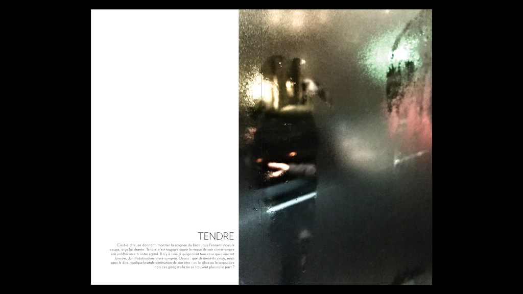 Nous manquons de mots pour désigner ce que nous vivons, mais il y a la friction des phrases et des images, ainsi que les sons (de l’angoisse à l’éclaircie) de Aaego1 accompagnant le fanzine – lien à télécharger donné ci-dessous.
