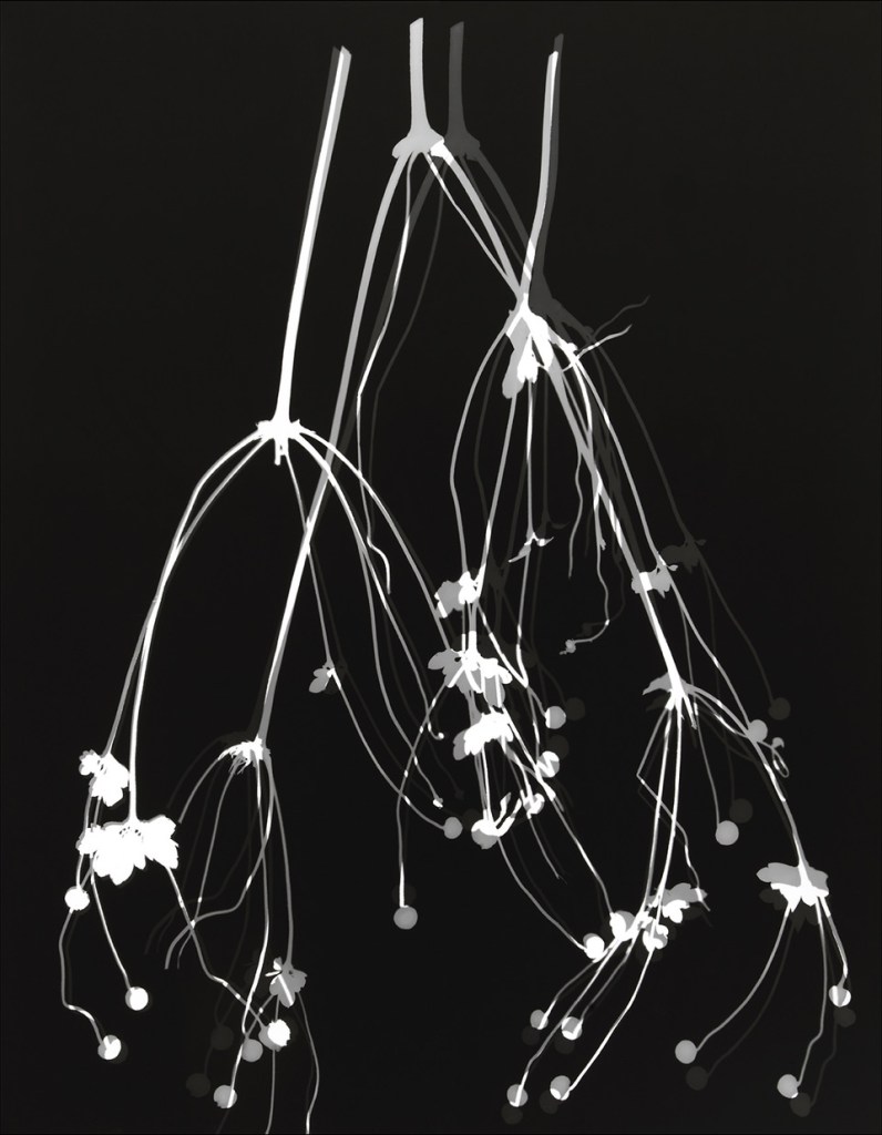 Ayant observé pendant les quatre saisons et durant deux ans le jardin de Monet à Giverny, le photographe ami du portraitiste Christian Courrèges a utilisé le procédé ancien du photogramme pour rendre compte de la vie intérieure des plantes et végétaux divers qu’il a collectés – on peut songer à Anna Atkins.