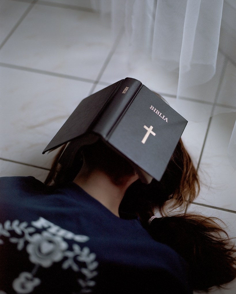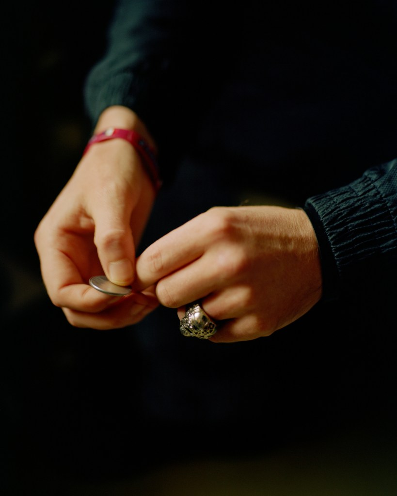 « Xavier, écrit le photographe, a déclenché un cancer après avoir vu son fils hospitalisé. Il sait que c’est cette vision qui a installé la maladie dans l’œil. Il porte depuis un bandeau qu’il fabrique lui-même. »