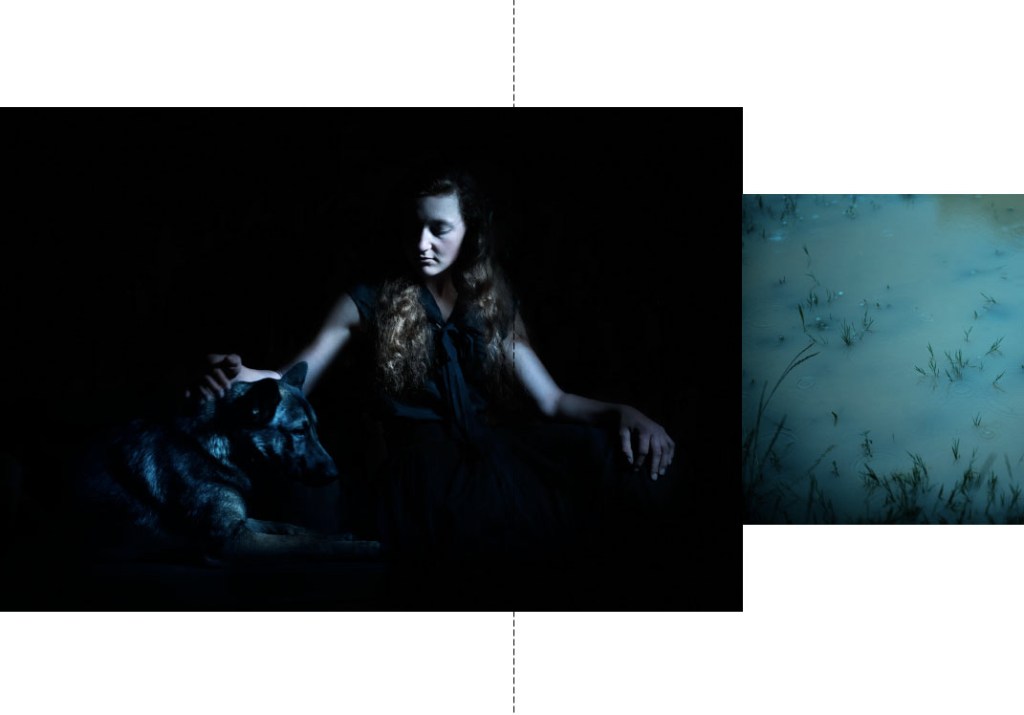 En des teintes bleu nuit, Florence Blondeau observe la façon dont l’humain et l’animal dialoguent.