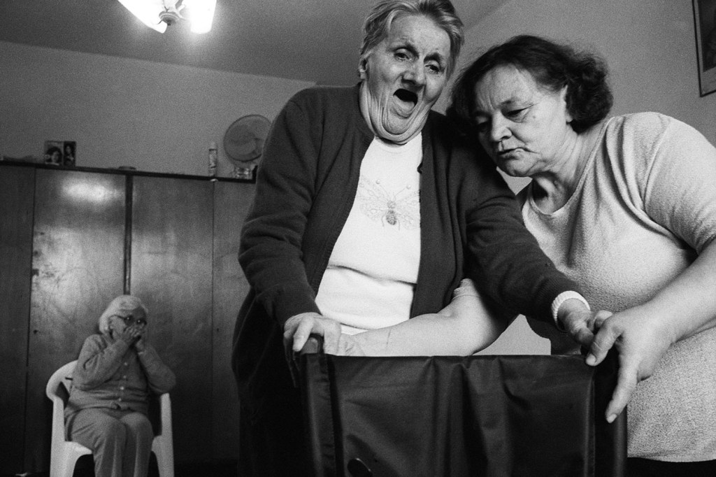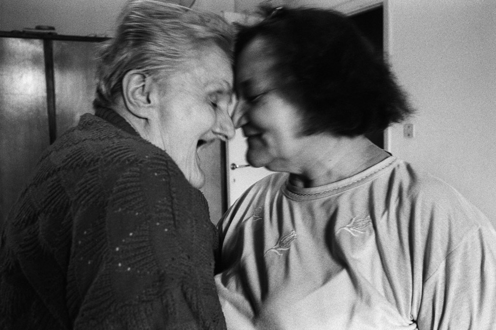 Jane Evelyn Atwood témoigne d’une relation très belle entre Darya, cinq-quatre ans, et les vieilles dames dont elle a la charge, faite de gestes précis et d’une douceur empathique nécessitant parfois aussi de s’imposer.