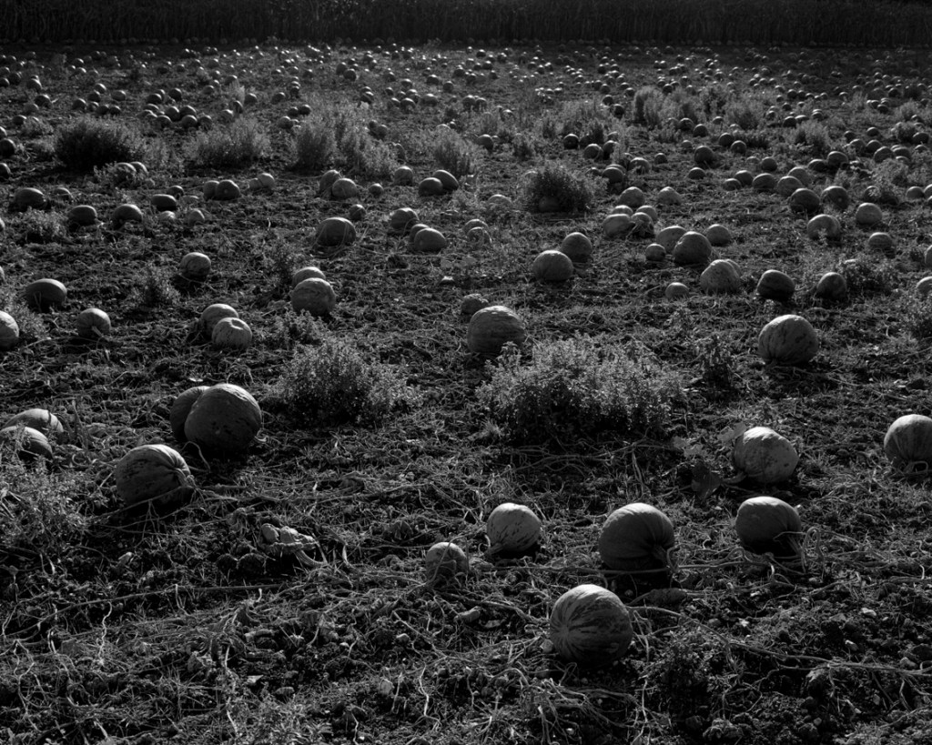 Les courges parsèment le champ à la façon de boulets de canon, de grenades ou d’obus n’ayant pas explosé.