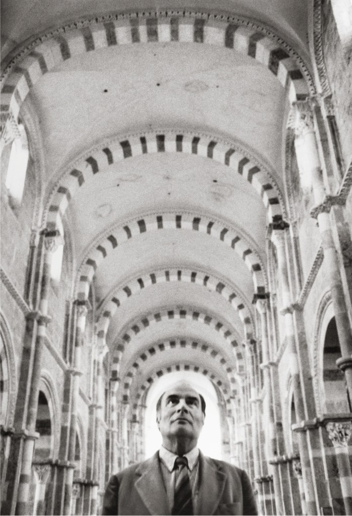 François Mitterrand sous la voûte de la nef de Vézelay paraît illuminé (1980).