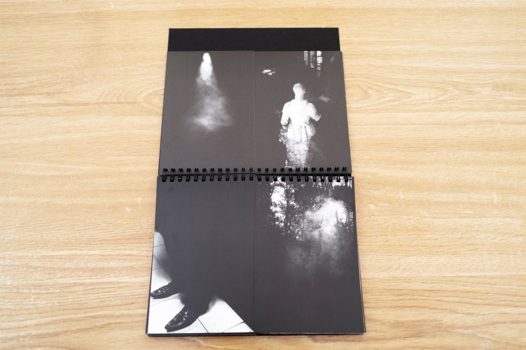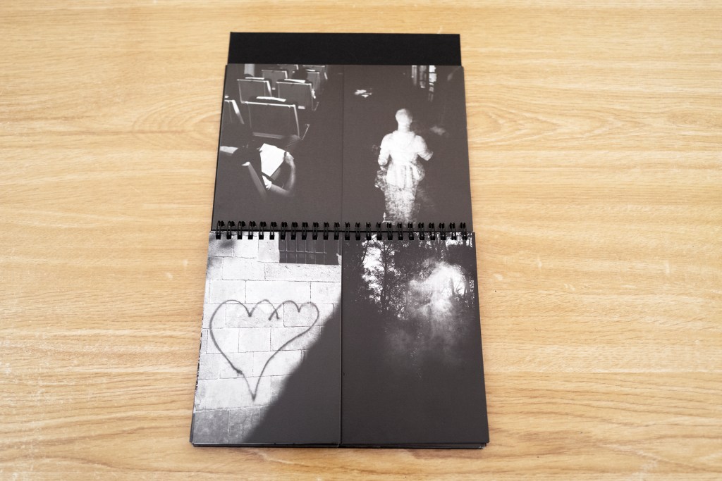 Imprimées recto-verso dans un noir et blanc très contrasté, les images de + de David Salcedo, publié en Espagne par Ediciones Posibles, se lisent et s’apparient de façon quasi aléatoire, les photographies étant réparties en deux jeux reliés par une spirale, la richesse du dispositif permettant de multiplier les pistes poétiques.