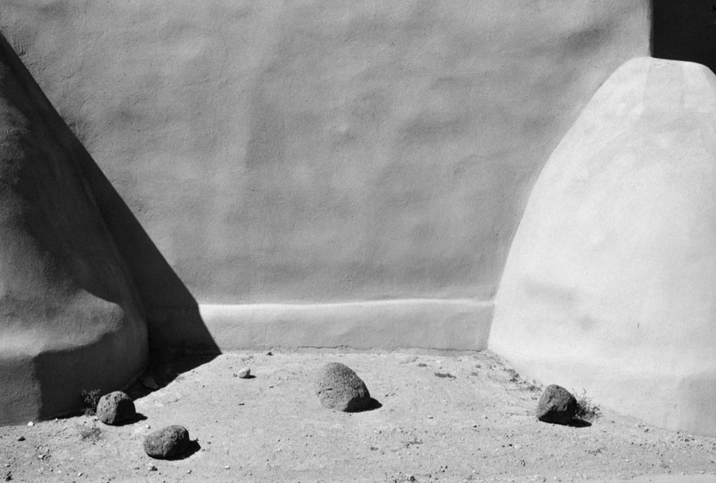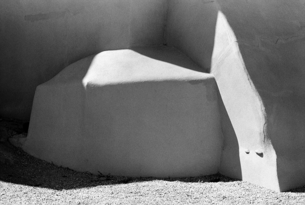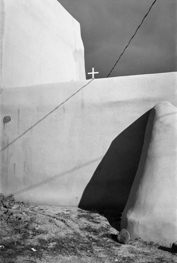 Lorsqu’il photographie de 1977 à 1983 l’église Ranchos de Taos, au Nouveau-Mexique, l’auteur du Voyage mexicain (Contrejour, 1979) rencontre un mystère, transmis aujourd’hui dans un portfolio conçu par son ami Guillaume Geneste comme un livre d’artiste publié à 90 exemplaires dans la collection « Tiré à part », qui comprend des titres rares confiés à Denis Roche, Bernard Guillot, Marc Trivier, Nair Benedicto, et… Bernard Plossu (Nord en Scope, 2007).