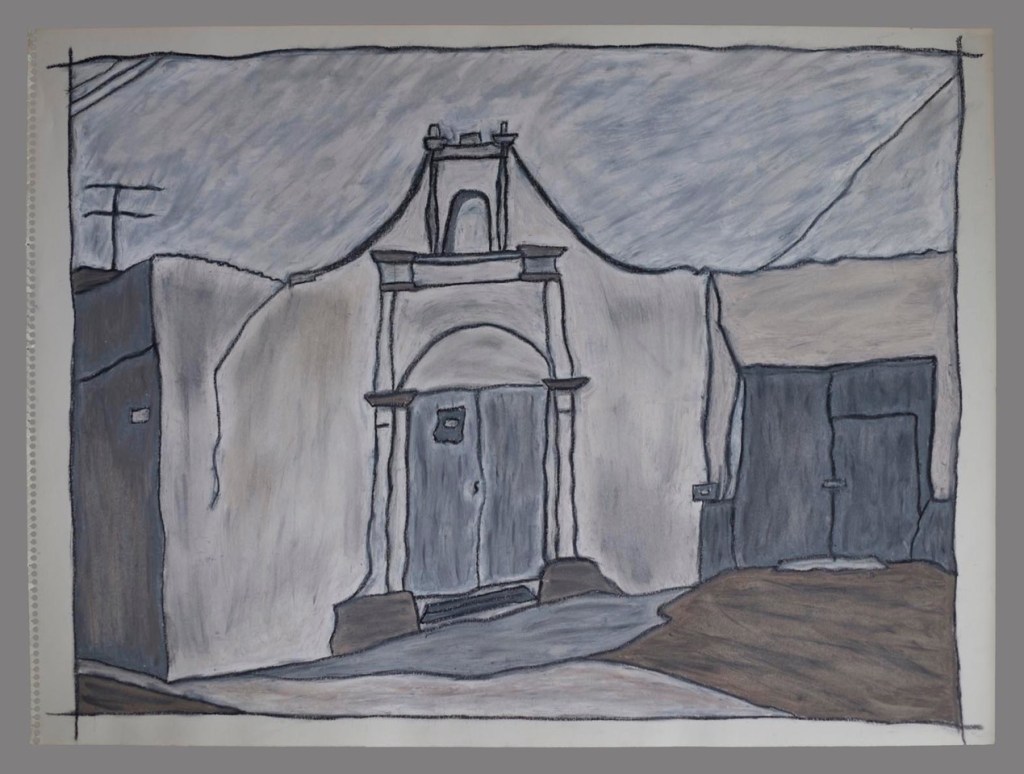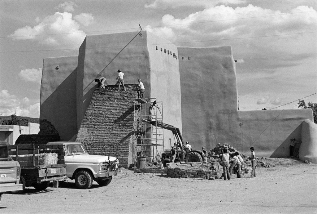 « L’église, écrit savamment Stuart Alexander, a été construite entre 1813 et 1815 à l’aide de matériaux traditionnels de la région. L’adobe, ou pisé, est constitué d’argile, de sable et de paille mélangés à de l’eau afin d’obtenir une sorte de boue. On peut en former des briques que l’on fait sécher au soleil. On en construit d’épais murs que l’on cimente à l’aide de cette même cette boue et que l’on enduit d’une couche finale d’adobe pour obtenir une surface lisse. Les murs sont par nature irréguliers, et au fur et à mesure que se produit l’érosion ils s’épaississent légèrement à la base. Chaque année en juin, juste avant la saison des grosses pluies, la communauté se réunit pour l’enjarre, une pratique rituelle au cours de laquelle les habitants refont l’enduit tous ensemble. Les murs extérieurs de l’église, érodés par la pluie et le vent au cours de l’année précédente, sont recouverts d’une nouvelle couche d’adobe qui à son tour altère subtilement leur forme et leur surface. »