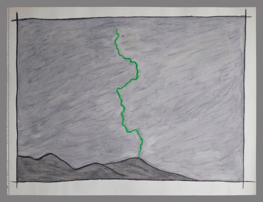 Une zébrure verte touche les montagnes de Santa Fé, sorte de double fantasmatique d’une photographie célèbre du maître prise en 1983 un jour d’orage.