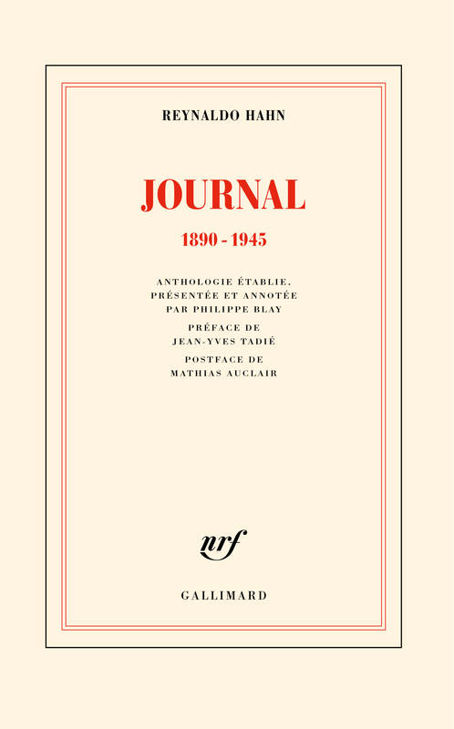 Reynaldo Hahn, Journal, 1890-1945, anthologie établie, présentée et annotée par Philippe Blay, sous la direction de Jean-Yves Tadié, préface de Jean-Yves Tadié, postface de Mathias Auclair, Gallimard, 2022, 402 pages