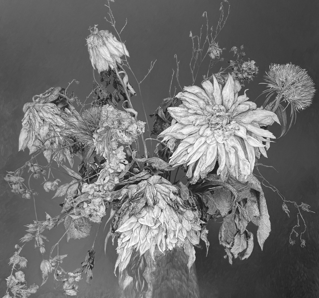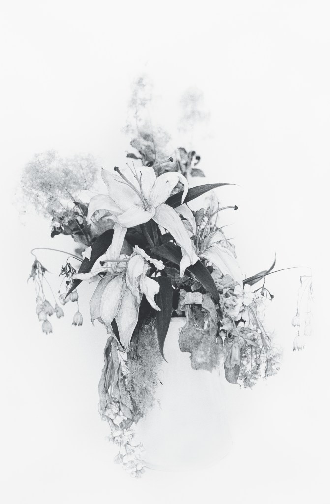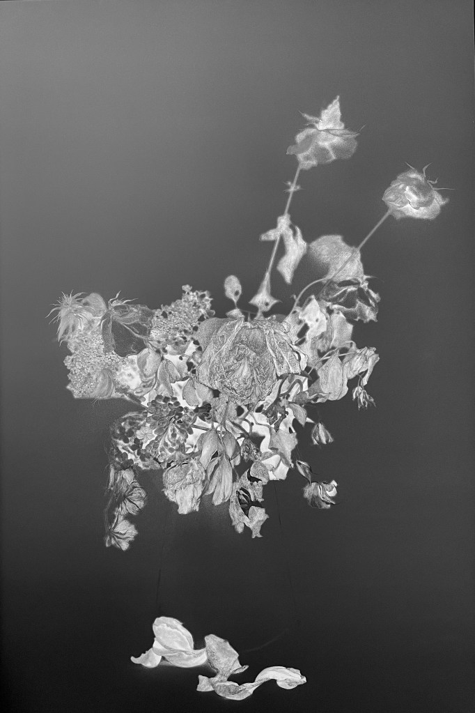 Comme le font Jean-Marc Cerino (essai de J.C. Bailly chez Macula, 2021), ou Anne-Lise Broyer, très bien analysée ici : « Des artistes comme Anne-Lise Broyer ont inventé des gestes seconds de traitement de la photographie qui ne visent ni à l’enjolivement (comme les pictorialistes), ni au renforcement de l’image mais à son apaisement et à son extension temporelle. Dans sa magnifique série Le langage des fleurs (qui fait référence à un texte de Georges Bataille exemplaire de sa conception du « bas matérialisme »), des bouquets à-demi fanés, photographiés en noir et blanc, sont retraités à la mine graphite, dans un continuum de douceur argentique prolongeant le flétrissement de la fleur par celui de l’image. Elle crée ainsi une brume temporelle où l’halogénure d’argent dépérit en même temps que son « sujet » en se ressourçant à l’antériorité du médium graphique. »