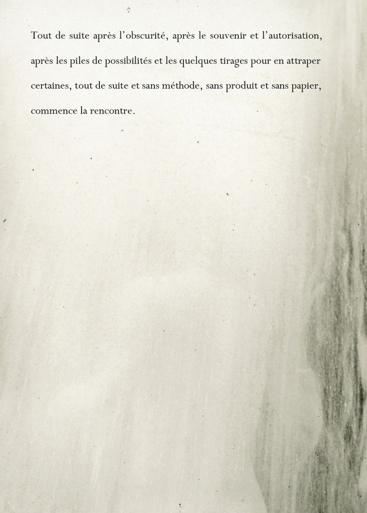 La pellicule est périmée, l’image se dégrade, le visage aimé est devenu herbe haute, frondaison, pluie d’atomes, brume.