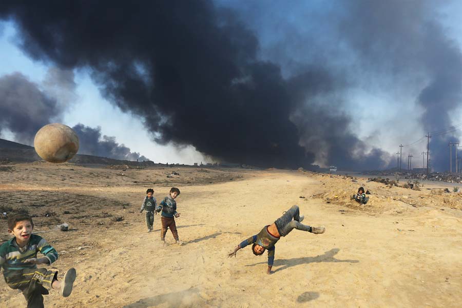 On sort des décombres un corps, des enfants jouent au football en riant alors que tout s’enflamme autour d’eux, un traitre afghan regardant l’objectif sera peut-être décapité.