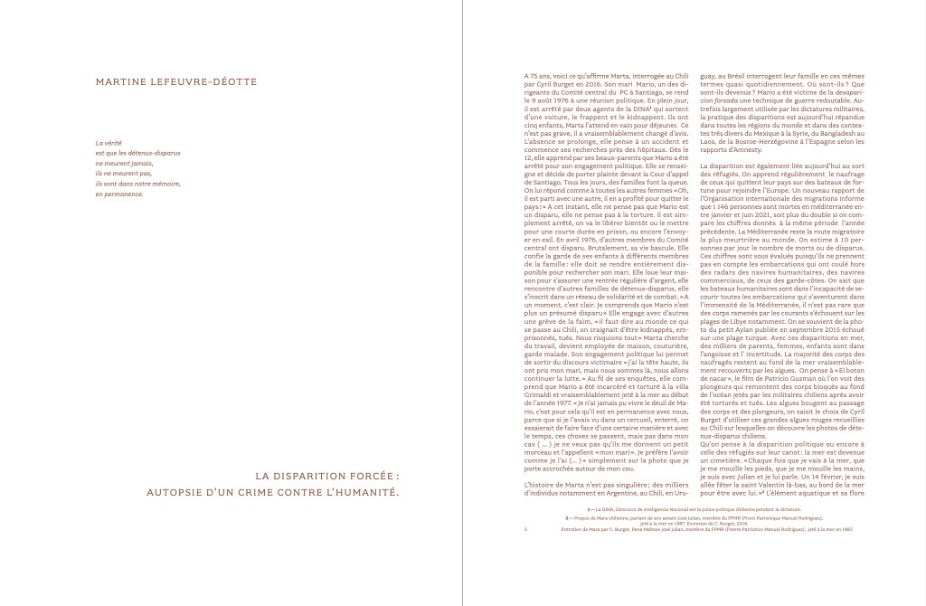 Dans le texte accompagnant le livre intitulé La disparition forcée : autopsie d’un crime contre l’humanité, la sociologue Martine Déotte analyse le drame des disparus politiques chiliens, d’Argentine et d’Amérique latine, ainsi que celui des réfugiés morts en mer Méditerranée.