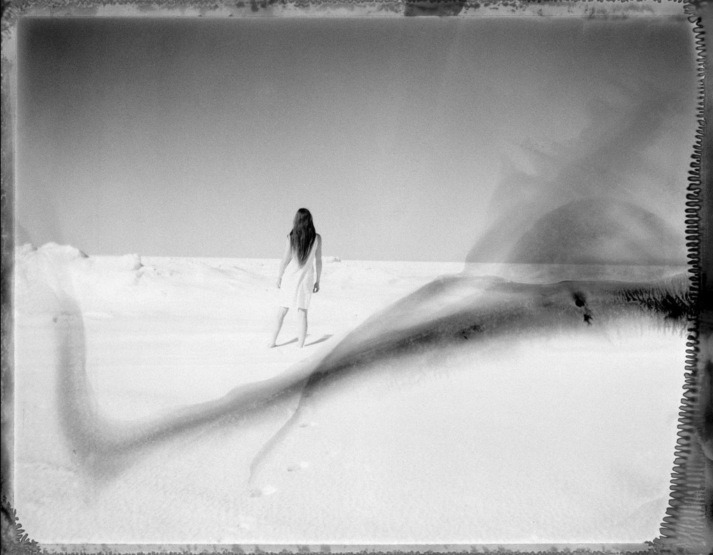 La photographe apparaît, pieds nus sur les cristaux adamantins, robe immaculée, longue chevelure noire.
