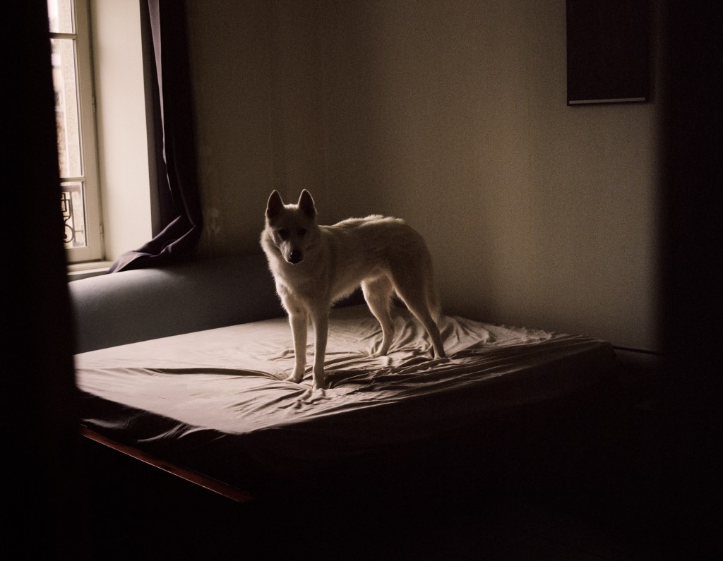 Un chien blanc debout sur un matelas est enfermé dans un appartement.