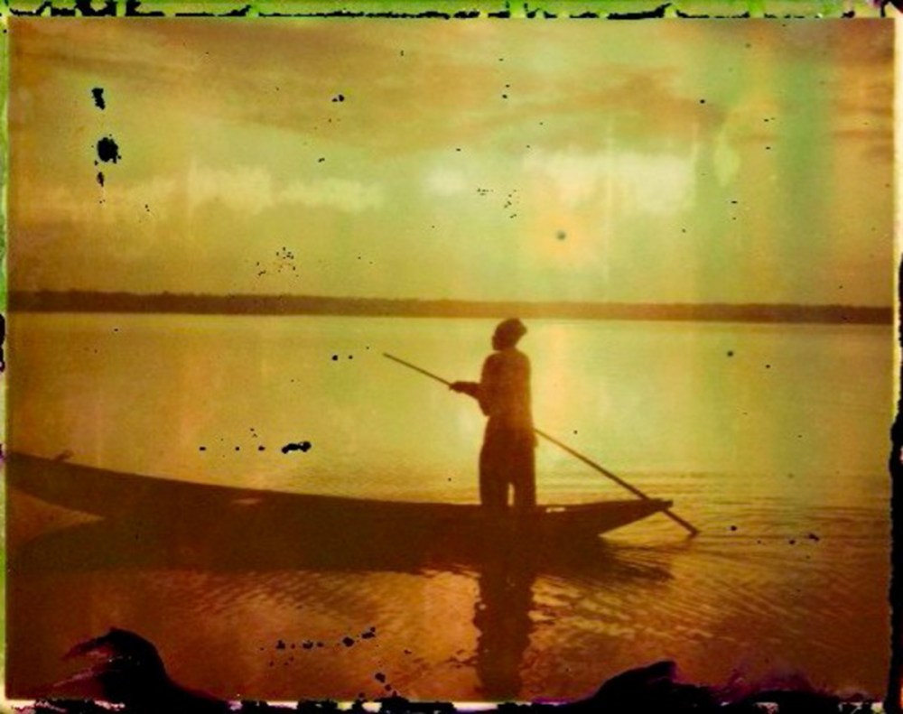 Un homme se tient seul dans le lointain sur sa barque. Est-il dans quelque bras du fleuve Niger arrivé à son delta ou sur le fleuve Ouémé ?