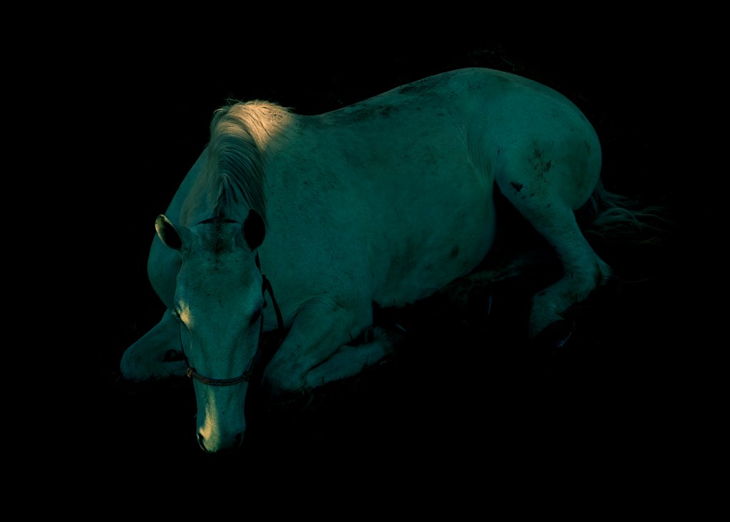 Un cheval vert dort, simplement éclairé d’un rai de lumière, touchant à la page suivante le sommet d’une montagne, puis un ange priant sur le faîte d’une chapelle effondrée, comme un ultime espoir.