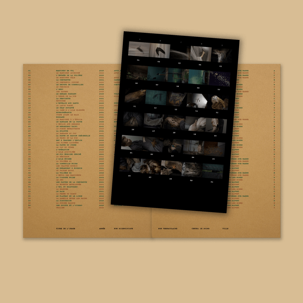 Sur feuille volante, est présentée la planche-contact des soixante photographies de l’ouvrage, qui montre la chorégraphie des mains expertes portant attention aux fragilisés.