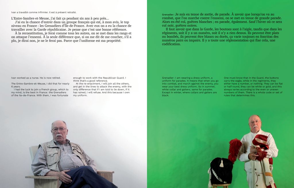 A sa façon finement subversive, l’artiste nous offre un voyage dans les archives, et la parole, faisant entendre les mots de Brigitte, pédicure médicale, et « rechercheuse », de Carl, tailleur de pierres, « reconstitueur », du Caporal Bistouille, caporal au deuxième régiment d’infanterie de ligne, 3e bataillon de fusiliers, et de quelques autres, faisant le spectacle.