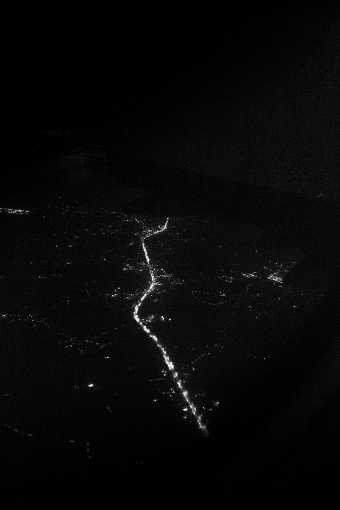 Des marcheurs munis d’une lampe frontale marchant non loin d’un volcan, ou d’un terril, ou du sein en poire d’une nymphe couchée.