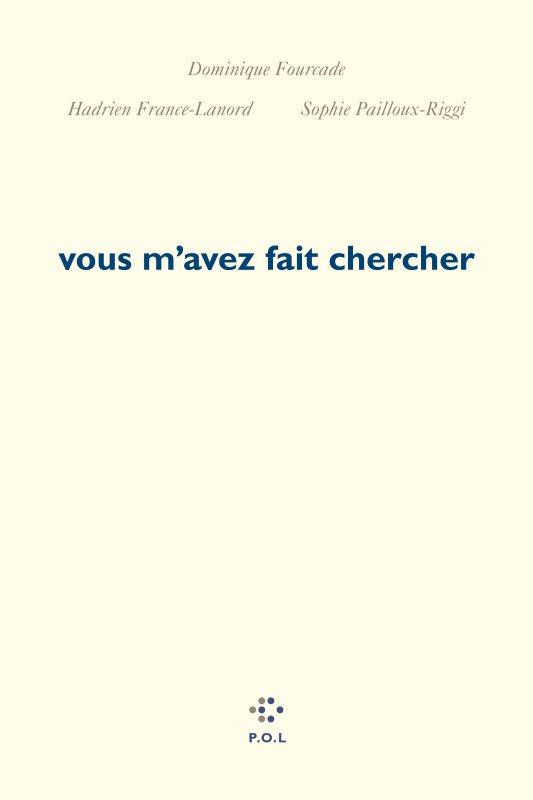 Langue nouvelle, forme nouvelle, brassées de mots et d’images, d’ailleurs, il y a en fin d’ouvrage trois photographies, grâce et malice féminines en chacune, rappelant la magistrale enquête sur l’inconscient visuel du poète coécrite ave Hadrien France-Lanord et Sophie Pailloux-Riggi, vous m’avez fait chercher (P.O.L, 2021, article dans L’Intervalle).