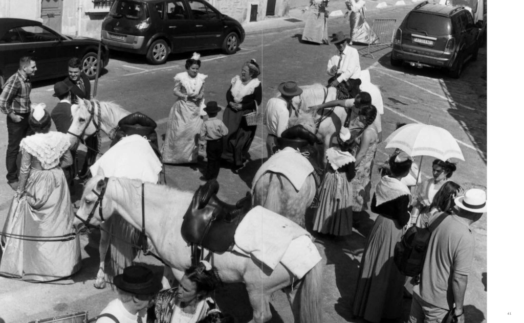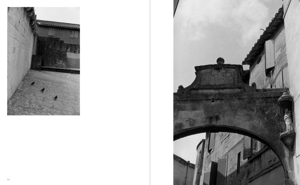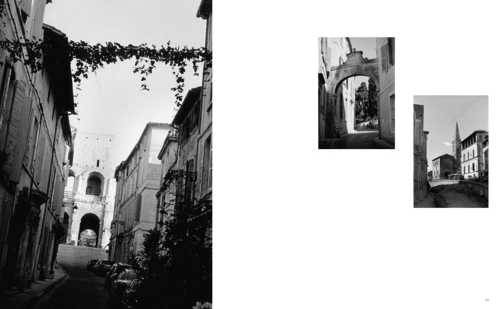 A la façon d’une ville marquée nettement par l’enchevêtrement des styles architecturaux depuis l’Antiquité – encore combien de trésors dans le Rhône -, In Arles, livre soigné et anar, est un chaos organisé – ne pas oublier de le regarder en pensant à la logique des diptyques – d’images d’époques et de tailles différentes.