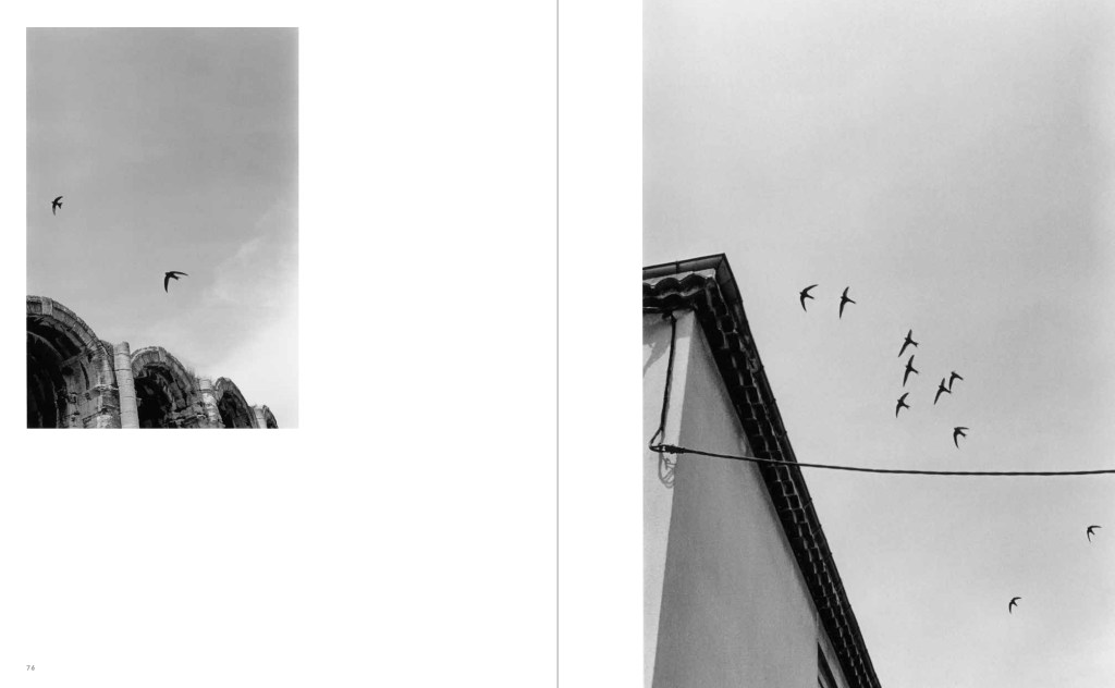 On reconnaît les motifs structurant le champ perceptif de Bernard Plossu, les oiseaux, les arêtes des édifices, les fenêtres de vision (portes, porches, trous), les véhicules motorisés, les jolies jambes des femmes.