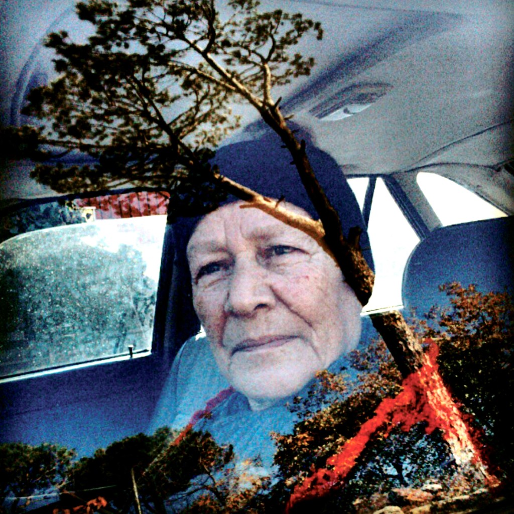 Apparaît le visage d’une femme photographiée par son fils, protégée par le tronc et la frondaison d’un arbre semblant la traverser.