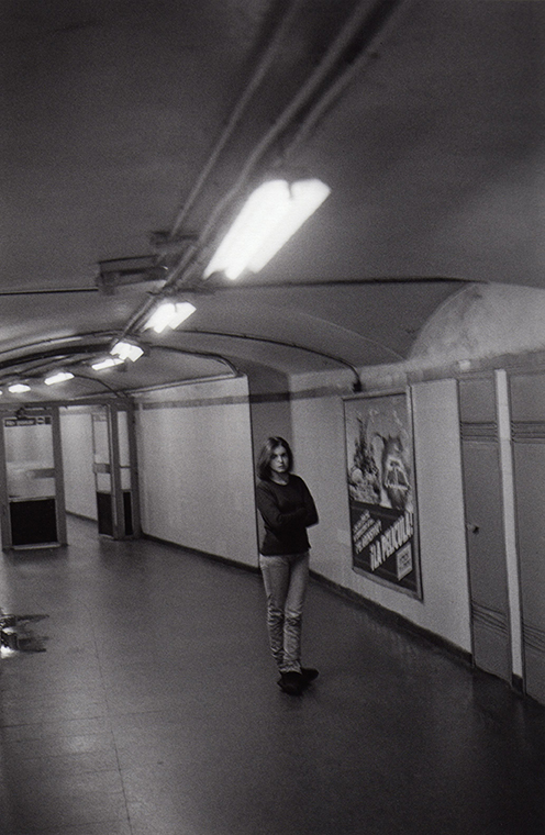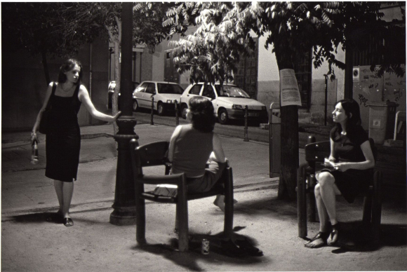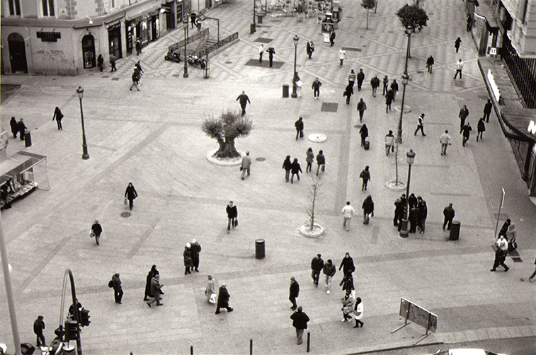 Une femme marche en tongs sur le trottoir, devant une construction recouverte d’une bâche, alors qu’au coin de la rue un jeune homme, appuyé sur un poteau de signalisation, attend le moment de traverser la chaussée : sensualité et étrangeté, quotidienneté et placement des corps dans l’espace entrant en résonnance inconsciente.