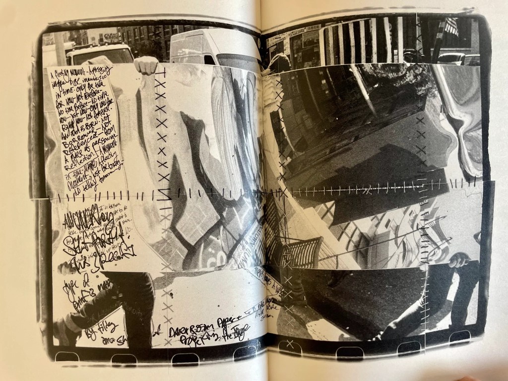 C’est à chaque fois une inventivité de formats, de rabats, de collages, de coutures, de disposition des images sur la page, de types de papiers, de transparences, de signes graphiques, d’écritures manuscrites ou non, de pliages, d’agrafages.