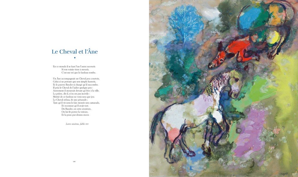 Mais La Fontaine, c’est aussi Marc Chagall, dont les éditions Nathan publient un album somptueux – doté d’un jaspage, et d’une tranche intégralement bleue – d’illustrations de ses fables, pas forcément les plus connues, ce qui est heureux.