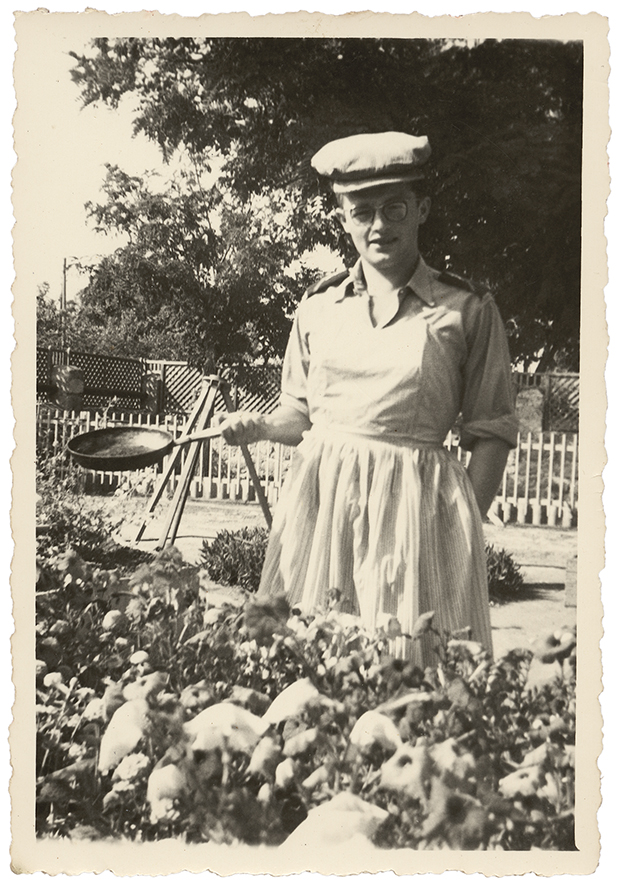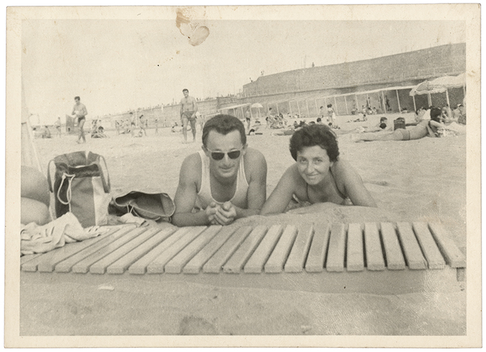 Le voici qui tient un transistor, ou un tuyau d’arrosage, ou pose, torse nu, près de son ami de régiment, Pierre, et de deux femmes élégantes, doucement sensuelles.