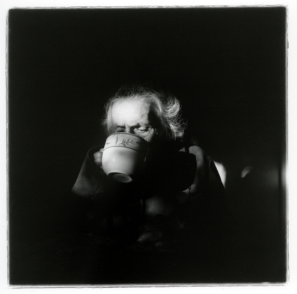 Une femme est là, ridée, noble, protégée par la nuit plutonienne de la page, buvant son café dans une grande tasse.
