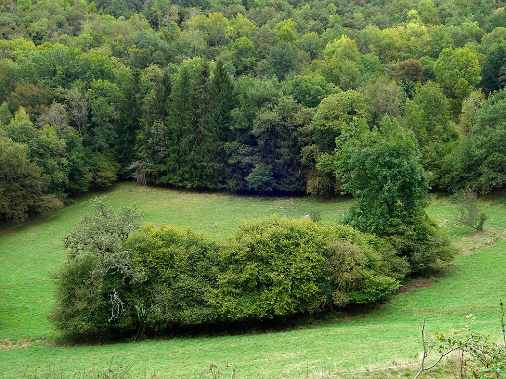 La pérégrine arrive à Saint-Jean-de-Buèges (bonjour au graveur et peintre Roland Sénéca qui vécut en ces contrées radicales lors de sa prime jeunesse artistique) : « Vallée magnifique, à l’écart des vacarmes, un bas-côté réconfortant. En forêt sur une courbe de niveau régulière, je la contemple. Je contemple tout court. Je bâtis mon temple à la beauté, aux souvenirs, à l’enfance. J’avance. »