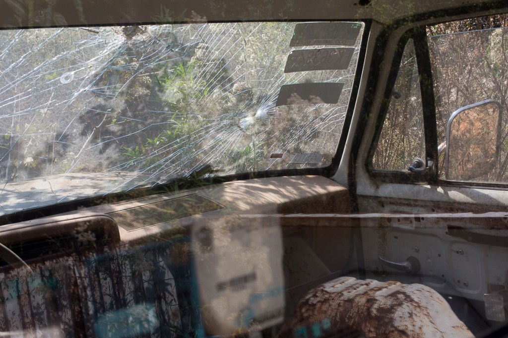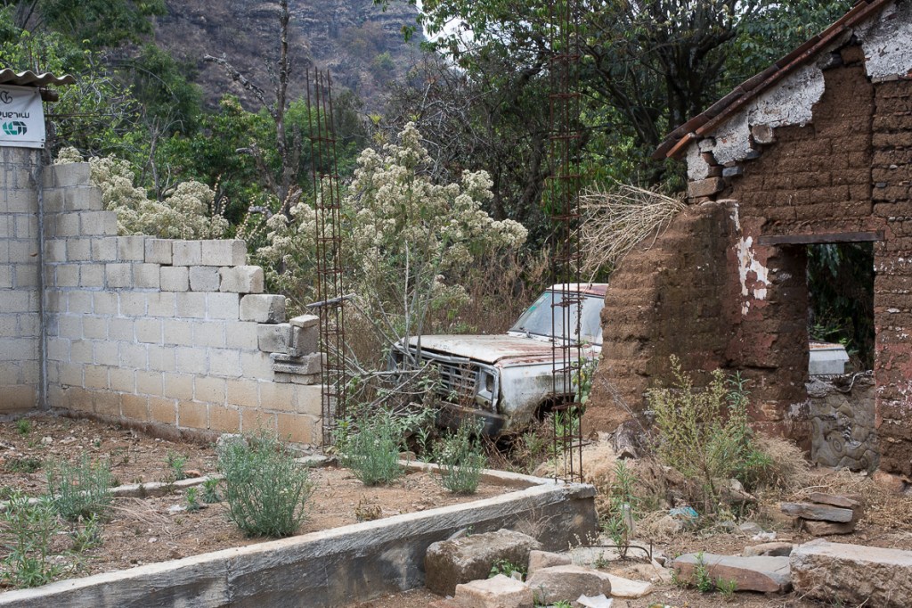 Une bâtisse en ruine et une épave de voiture.
