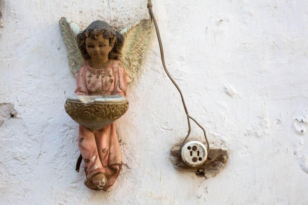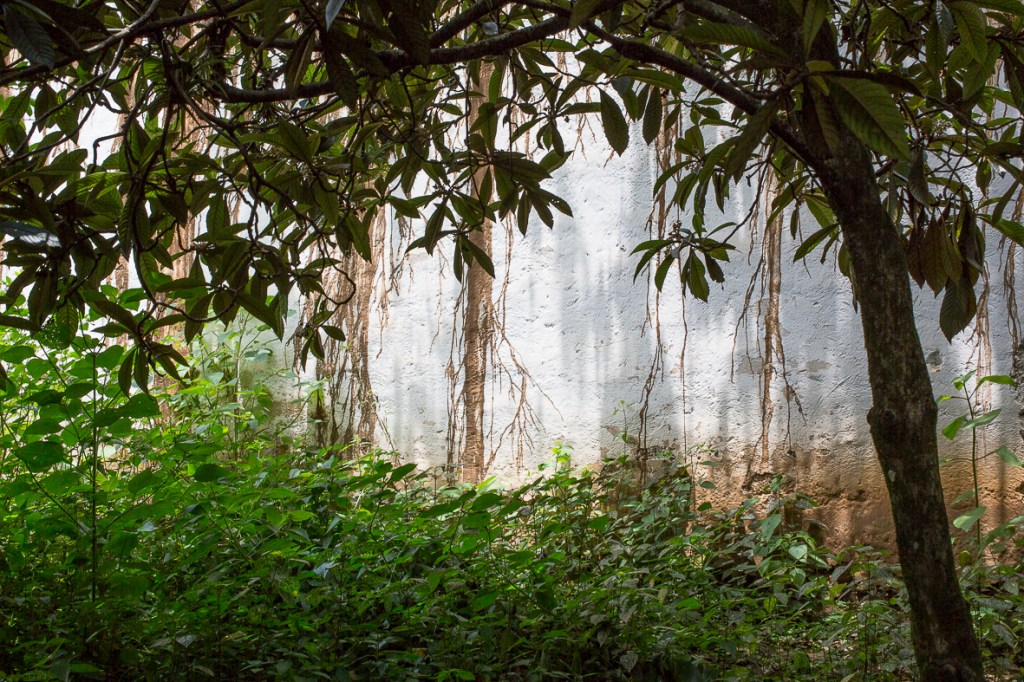 Des murs chaulés de blanc et des racines brunes, des bâtiments en construction abandonnés.