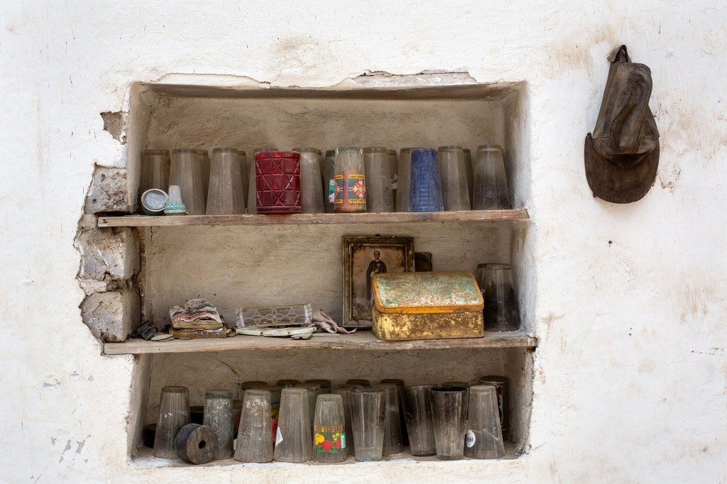 Des magazines gondolés, des cassettes audio formant une petite installation désolante.