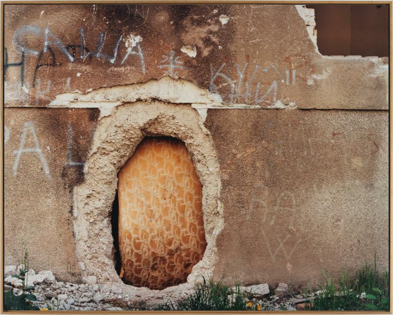Sophie Ristelhueber s’explique : « Cette idée du pansement, du matelas, a fait son chemin, et je me suis rappelé un matelas que j’avais photographié à Sarajevo, qui occultait un énorme trou d’obus dans un mur. C’était au rez-de-chaussée d’un immeuble, ce matelas était comme un pansement qui empêchait les gens, les snipers, de voir à l’intérieur. Donc j’ai utilisé cette image-là. Cette image de trou est assez violente, et en même temps on pourrai la dire sexuée… Sur le mur dans lequel il y a ce trou d’obus, il y a des tags, c’est un mur qui a déjà été bien martyrisé… Et j’ai tiré cette image sur ce fameux format de billboard qui faisait deux mètres quatre-vingts sur cinq mètres soixante, qui a plus tard été présenté dans la cour de PS1 à New York. »