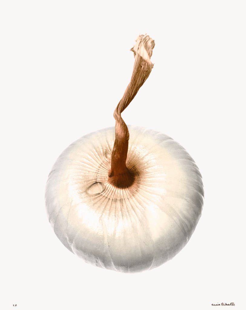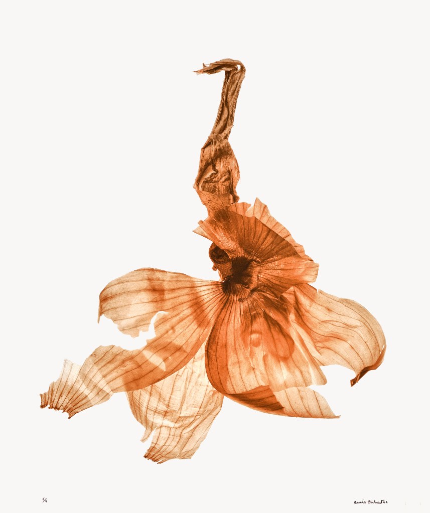 « L’oignon est un astre et une cellule, une branche et un pli de chair. Sa structure témoigne de sa génétique de croissance, c’est un précis de mûrissement. Sa couleur innommable que traduisent les virages à l’or, réalisés sur les tirages argentiques, crée une teinte que seule celle d’une peau peut évoquer : une membrane devenue surface, une foliation devenue parure, une couleur qui est tout aussi bien une matière. »