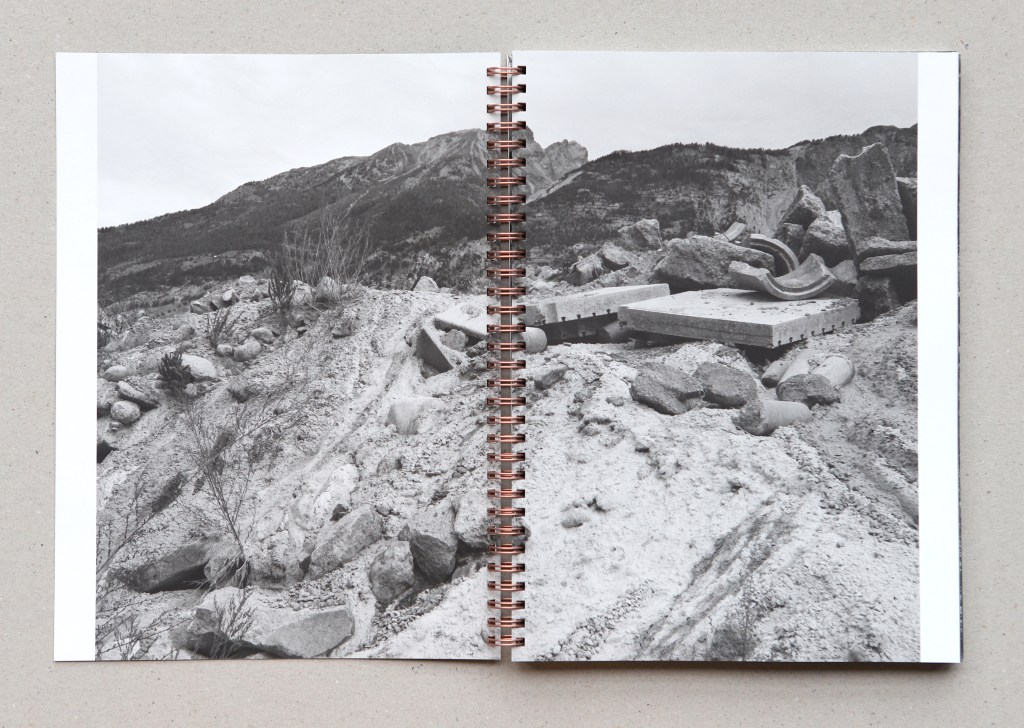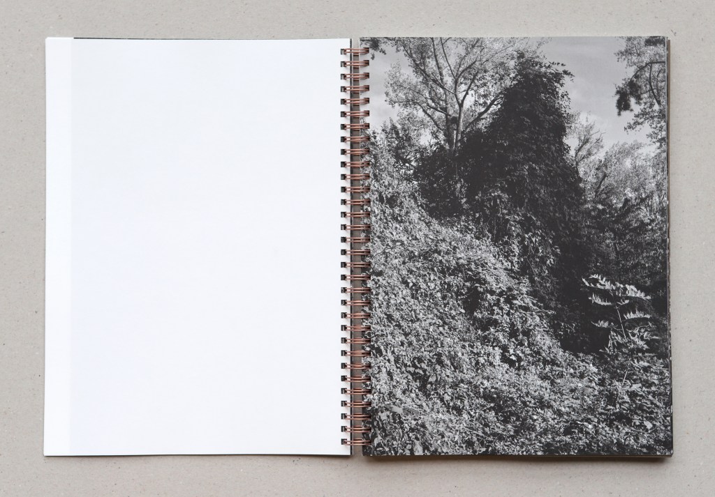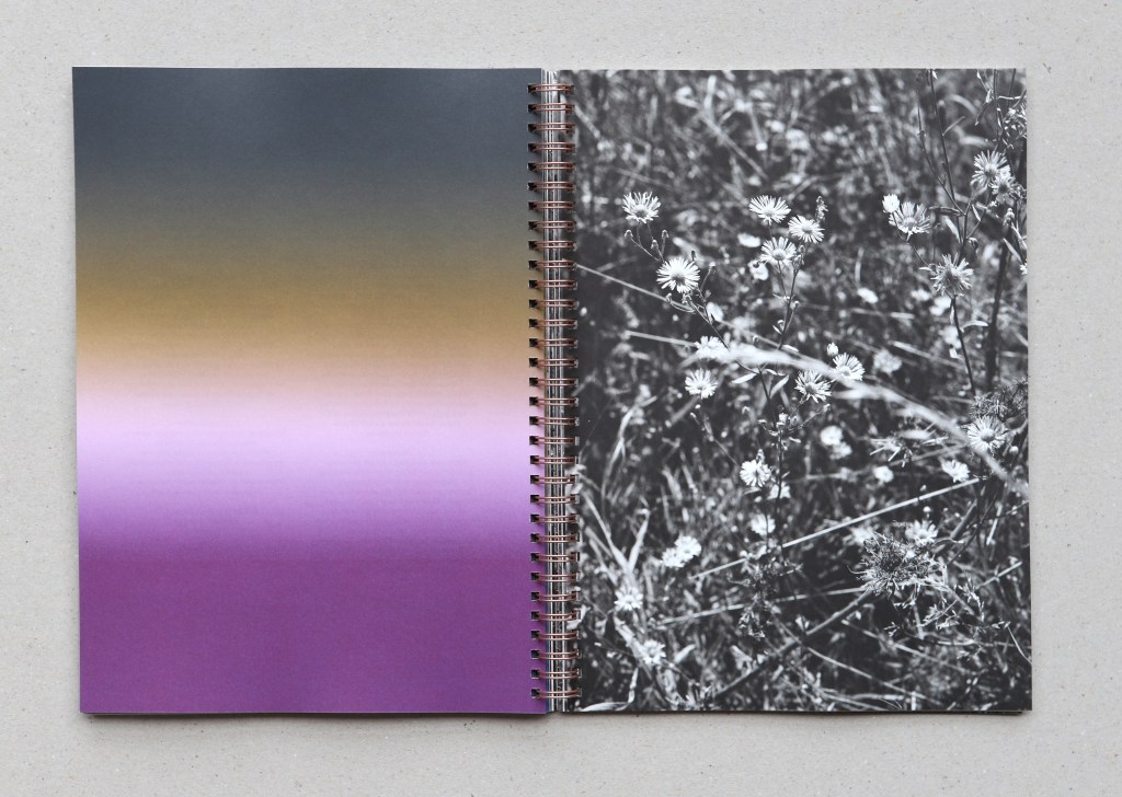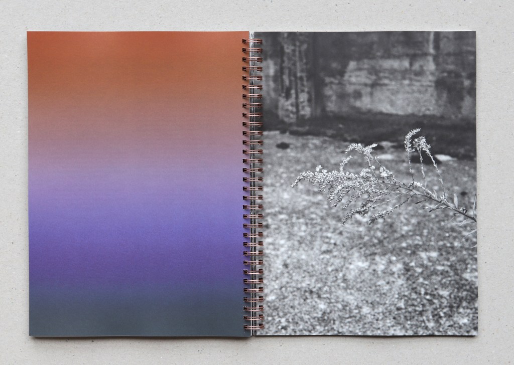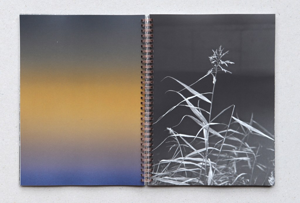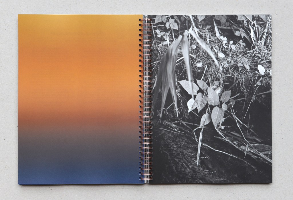 Pour chaque nouveau sujet, l’artiste renouvelle son support, son troisième volume, dont la reliure est une spirale aux teintes cuivrées, montrant en noir & blanc plantes et herbes ayant le don de s’implanter dans des écosystèmes affaiblis, photographies – on pense à l’esthétique de la Nouvelle Objectivité telle que déployée par Albert Renger-Patzsch – alternant avec des images abstraites colorées à la façon d’un diagramme de spectrogramme.
