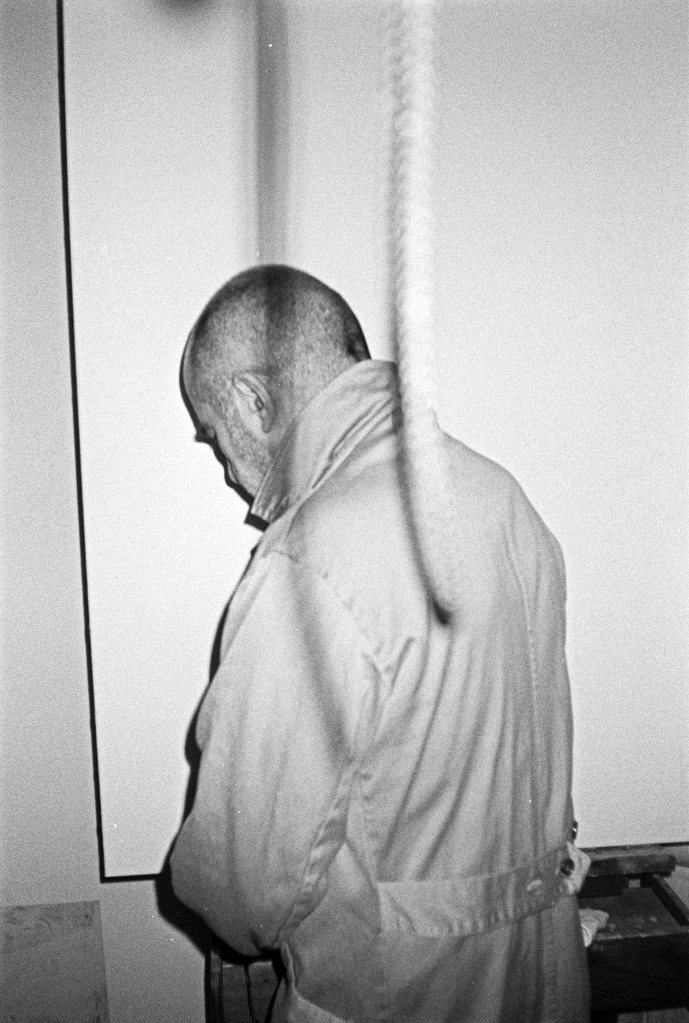 L’homme à l’imperméable, unique sujet de la série, est toujours là, une corde pend, on remarque une toile blanche, faut-il penser au pire ?
