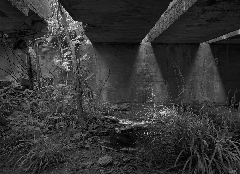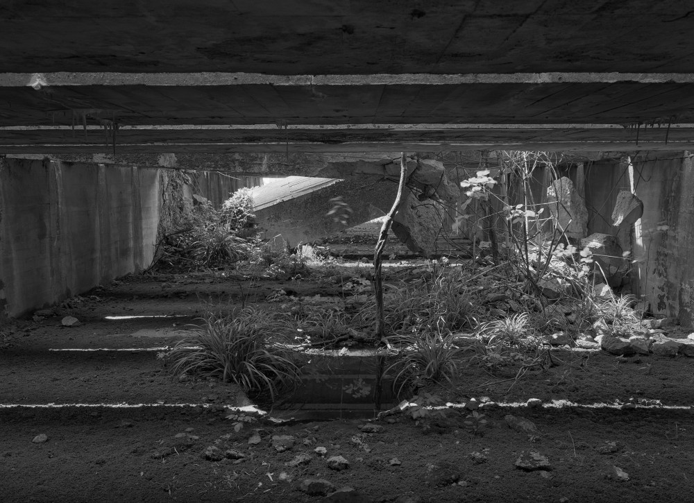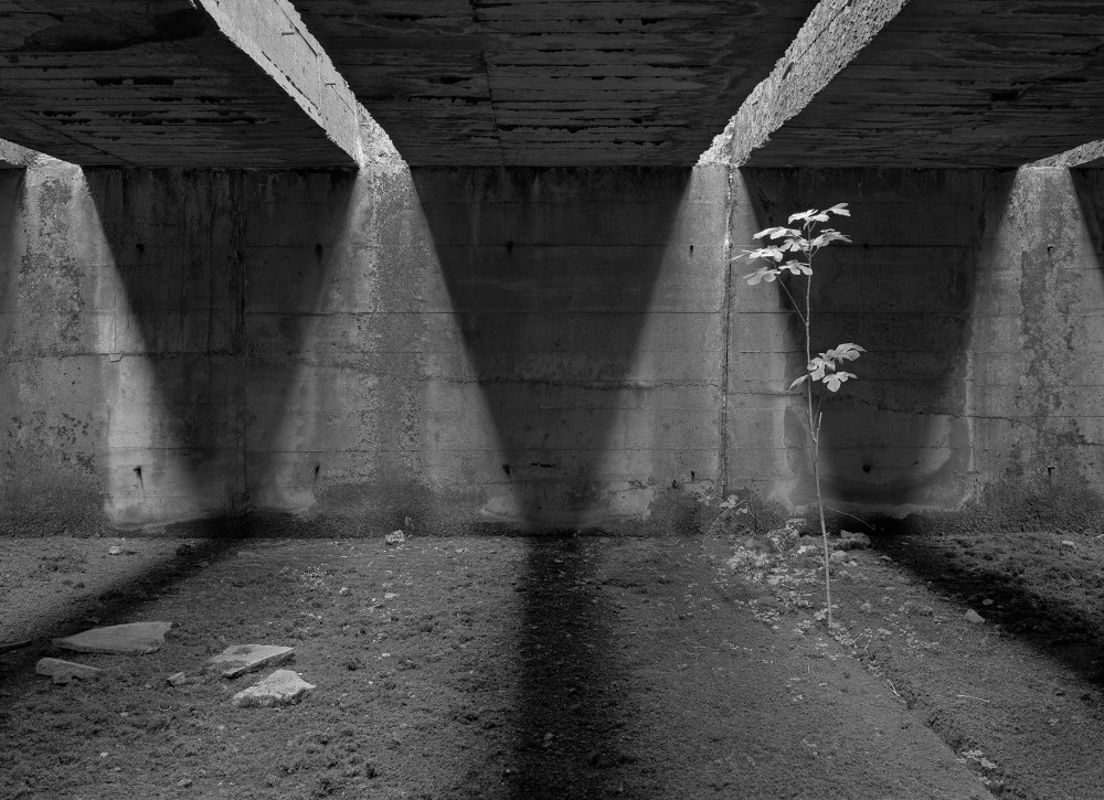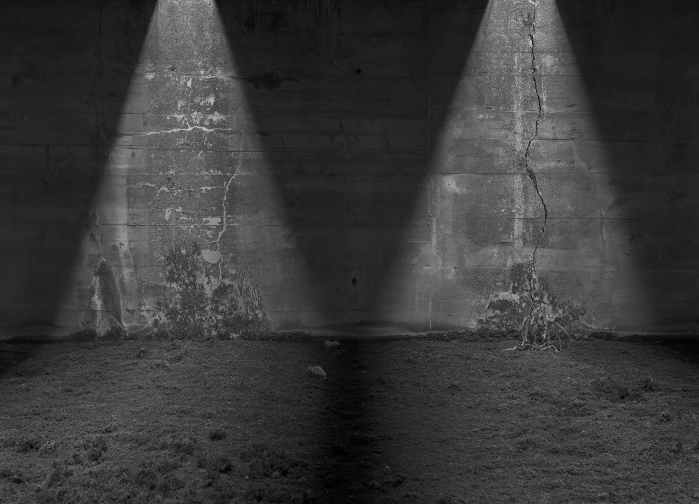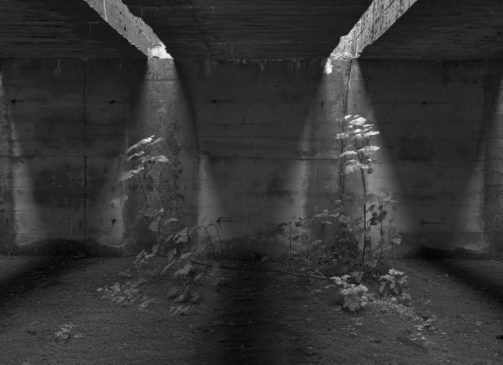 Dans ce lieu bâti par les esclaves du Reich, l’artiste a trouvé une grotte initiatique peuplée de pyramides de lumière et de torii involontaires.