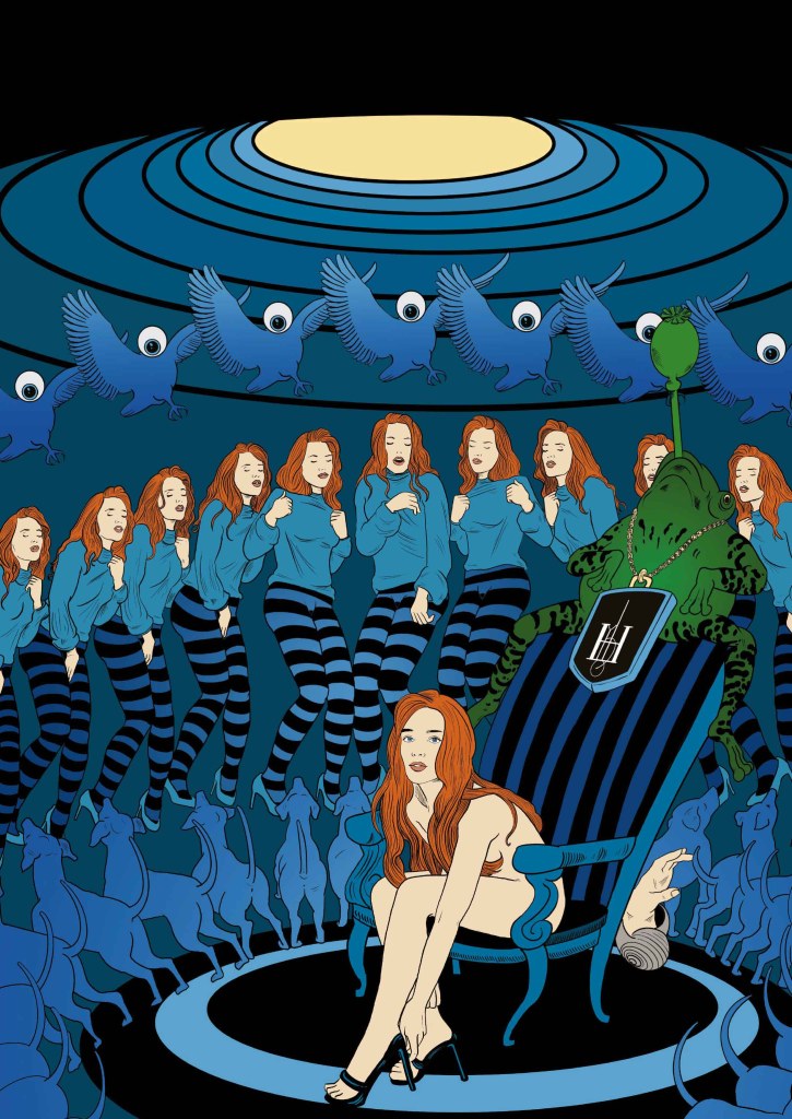 Une femme aux multiples mamelles, que regarde un parterre se spectateurs assis dans des fauteuils rouges, se penche, tétée par des faons. Elle a baissé sa robe sur ses cuisses, une lumière l’éclaire à la façon d’un projecteur.