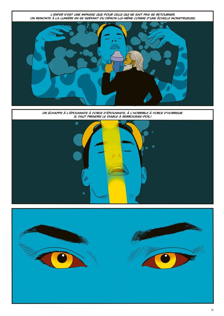 Multipliant les cases au symbolisme remarquable, Damien MacDonald, adepte de la ligne claire, crée des images de l’ordre de l’explosante fixe mentale.