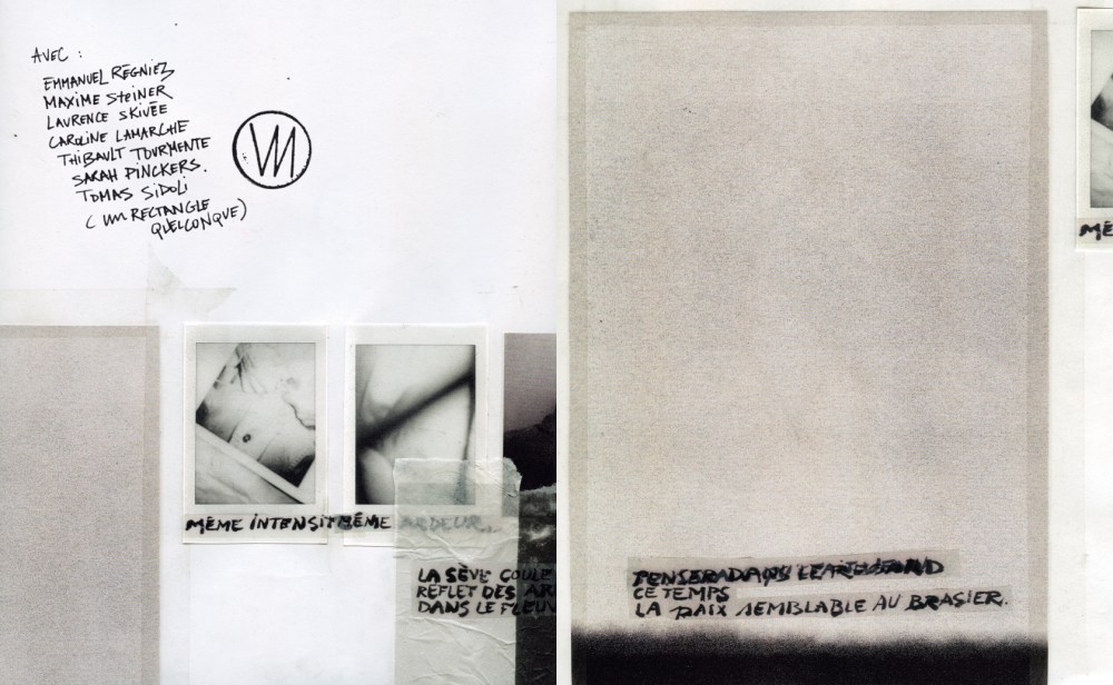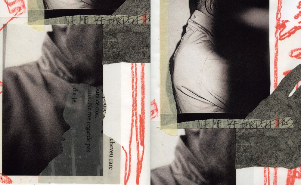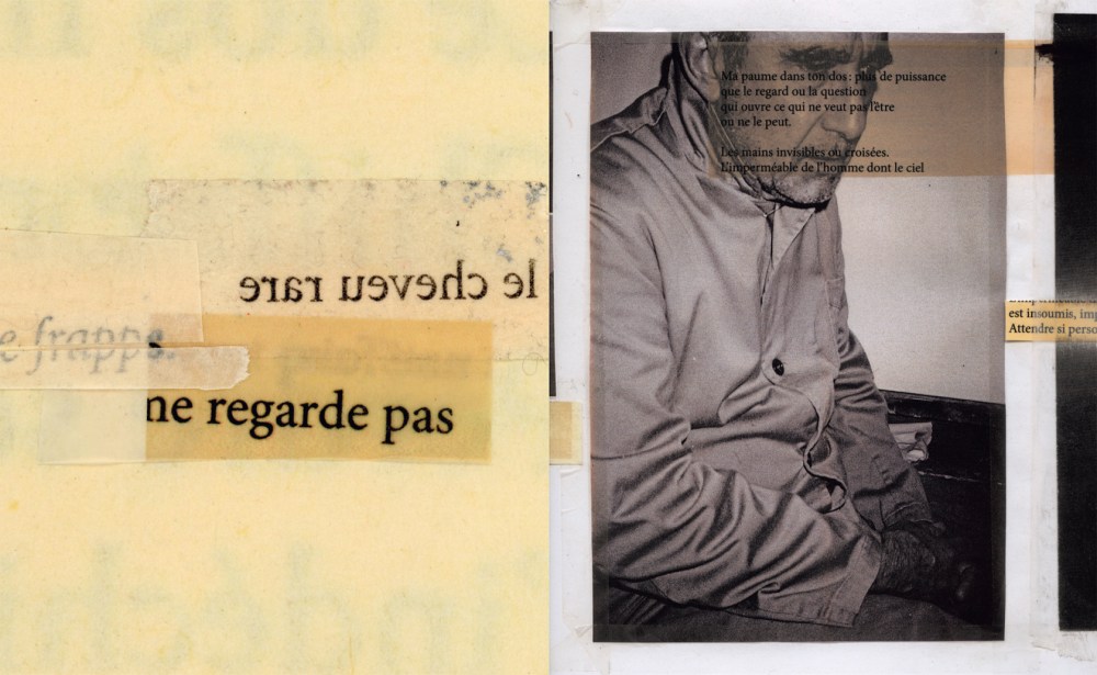 Des mots, des phrases, généralement tronquées, ou rendues peu lisible par la pratique de la superposition, sont repris : « tu tiens », « tu tiens sur tes épaules », « inconfortable, une position qui te conforte, te réco », « fragments épar », « monde et le ciel, enfin tenus, enfin retenus ; fragments d’une catastrophe », « Ne me regarde pas ».