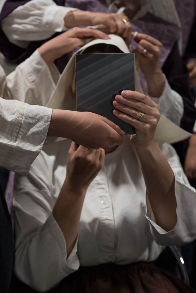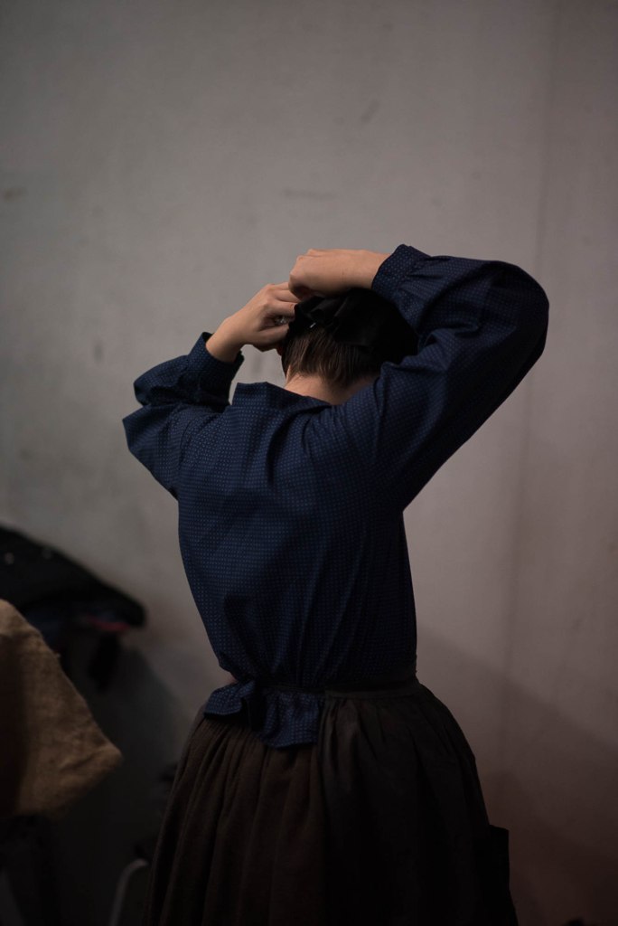 Nous pourrions être dans un tableau d’intérieur d’un peintre flamand du XVIIème siècle, ou dans quelque rush non monté par Alain Cavalier au moment où Thérèse, quittant ses habits laïcs, devient carmélite, mais non, nous sommes un peu partout en Bretagne, dans ces moments de préparation et d’attente, où, lors de festivités et championnats de danse organisés par des cercles celtiques, de jeunes femmes revêtent costumes et coiffes traditionnels.