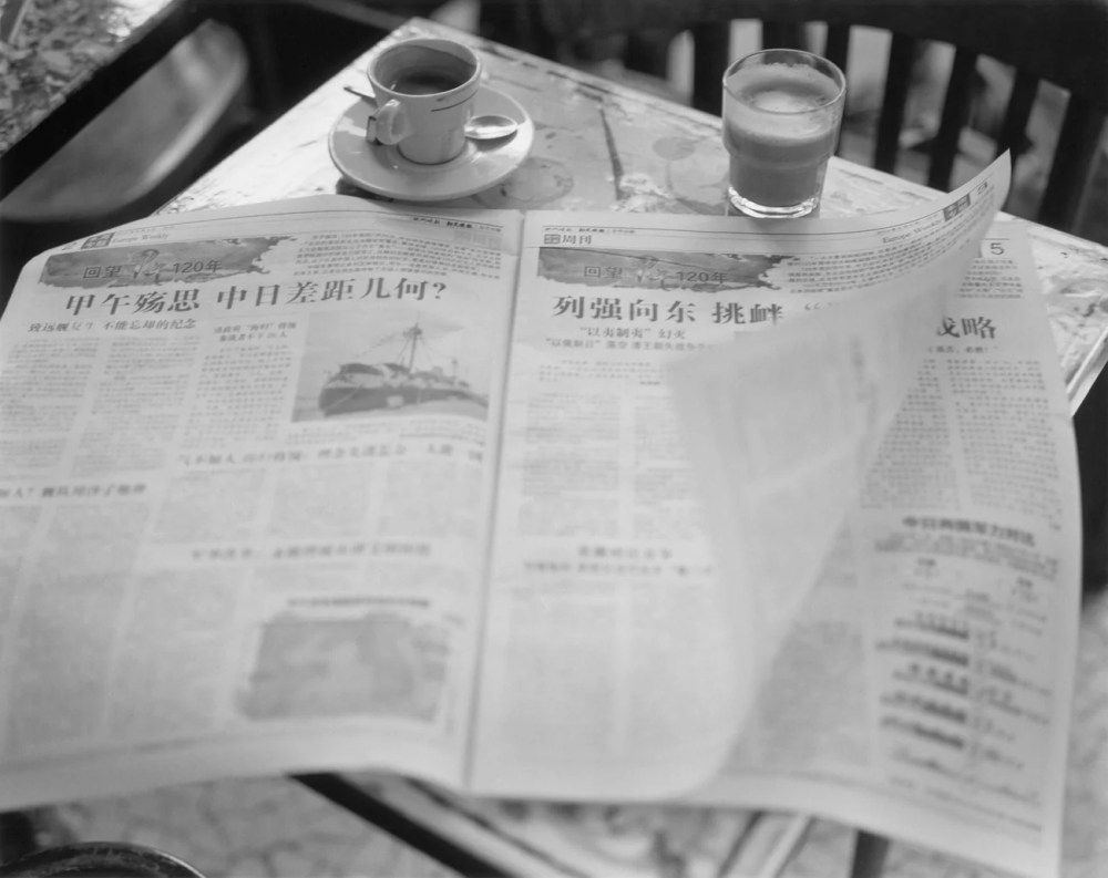 Un melon repose sur le bord d’un évier, près de diverses bouteilles entourées de noir, un marché se termine, un café vient d’être pris par un quidam.