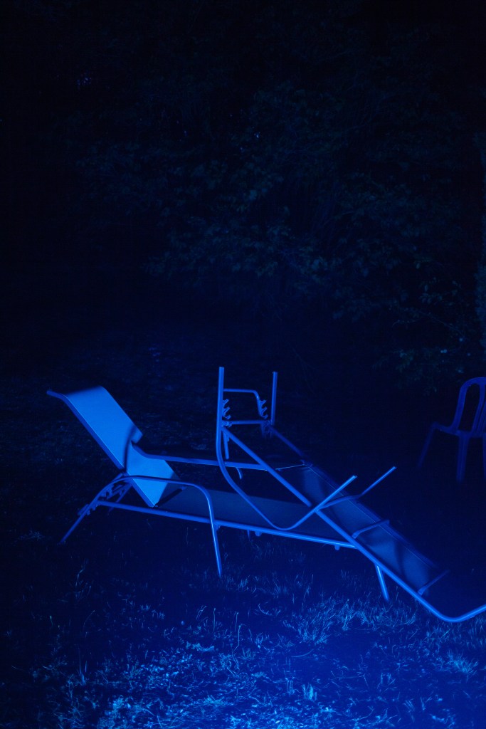 Il y a des chaises, des transats, une table, une boule disco, la fête est finie, ou peut-être va-t-elle recommencer.