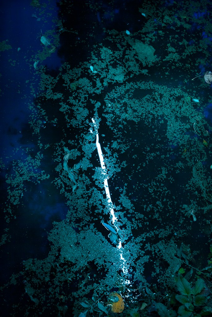 Lentilles d’eau et nymphéas flottent, métaphores d’un corpus donnant la sensation de percevoir le visible depuis une substance amniotique.